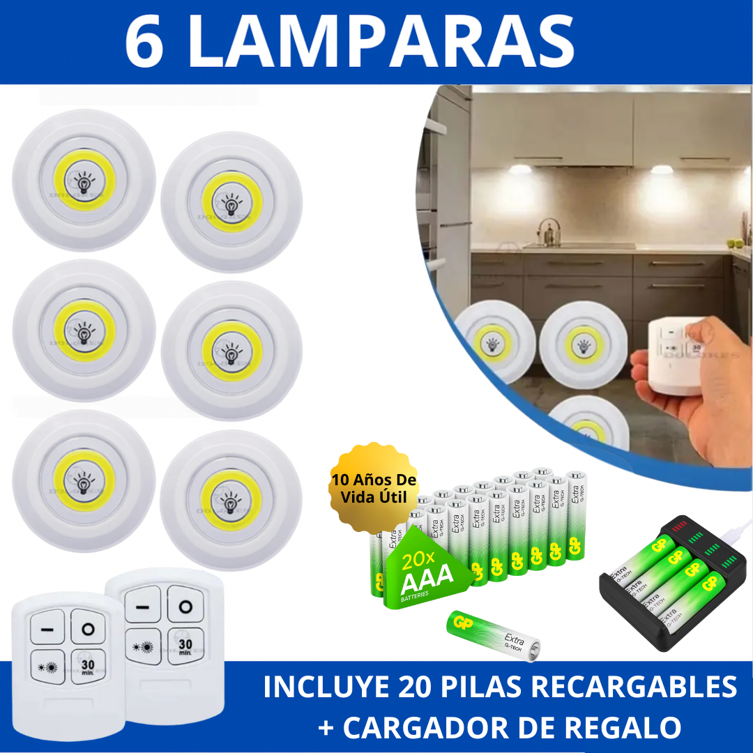 InstaLuz® - SUPER KIT 6 Lámparas LED Inalámbricas A Control Remoto + 20 pilas recargables + cargador 🔋⚡